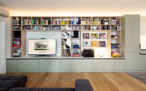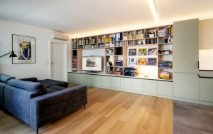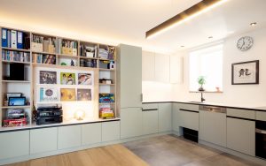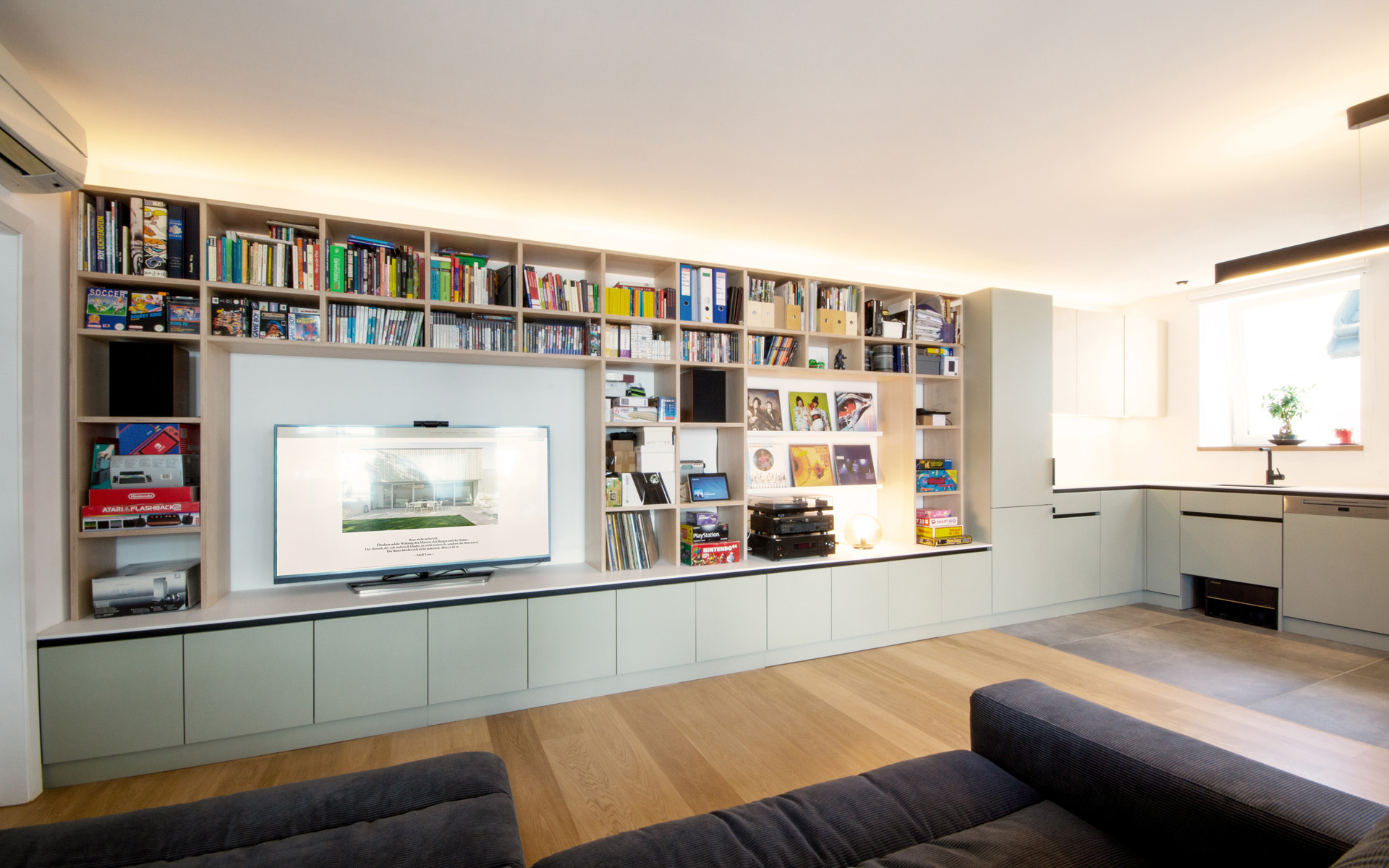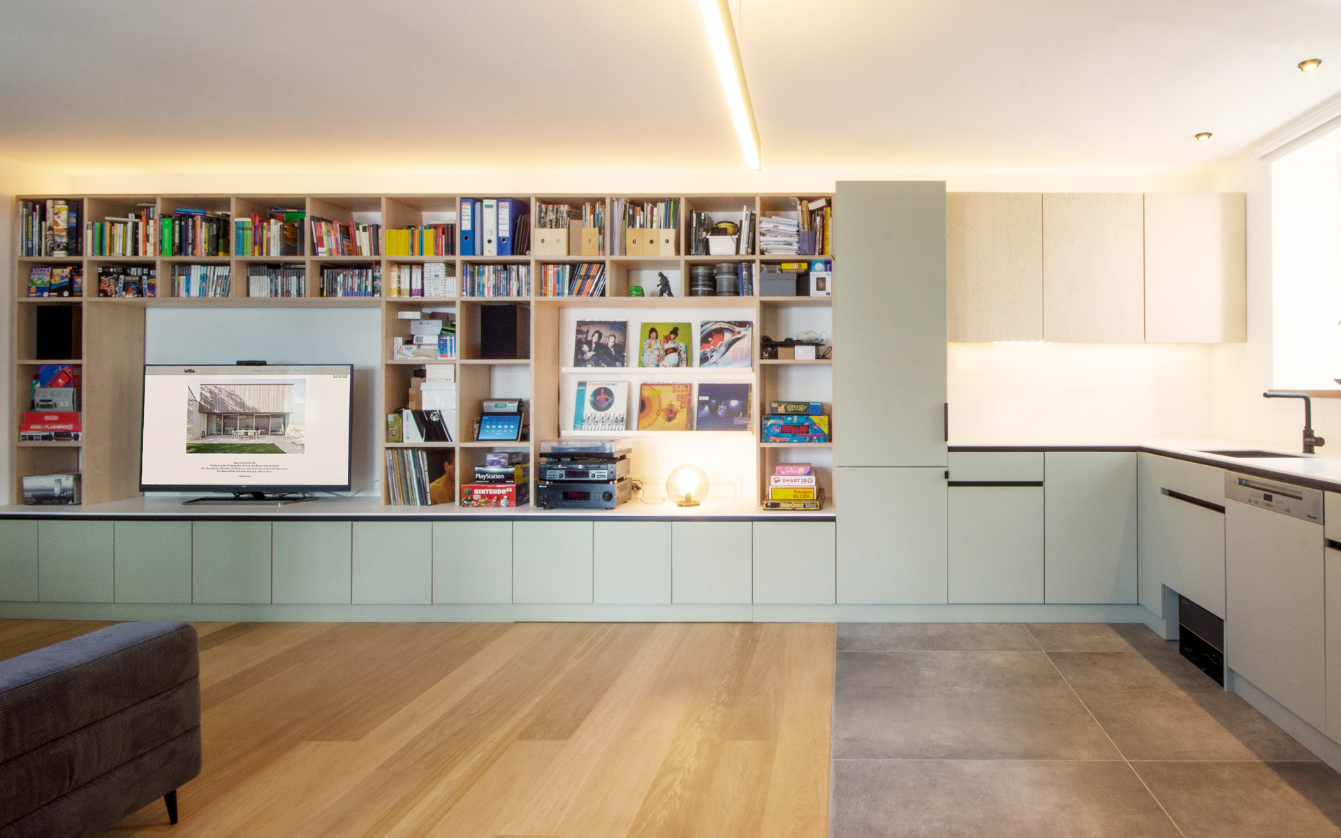 Der Schrank bildet den Startpunkt einer durchgehenden Möbellinie in Salbeigrün. Sie wächst nahtlos in den Wohnraum und geht in die über Eck geführte Küche über. Der Kühlschrank markiert durch seine Höhe die Funktionstrennung zwischen Küche und Wohnbereich. Die Linie setzt sich als Wohnwand fort, unten geschlossen und oben mit offenen Regalen aus Birkensperrholz. Diese Möbellinie endet im Schlafzimmer und greift dort optisch den Beginn im Vorraum auf.