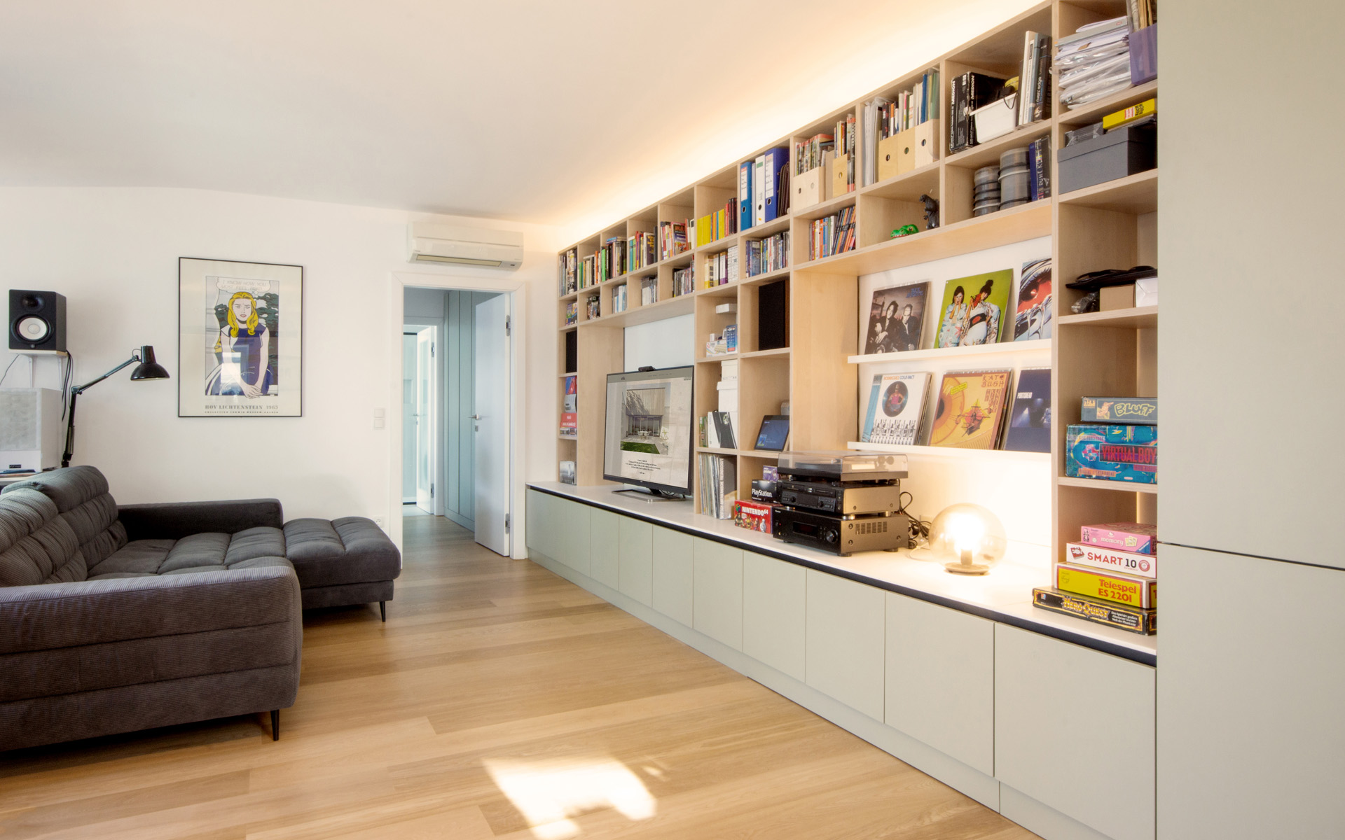 Die Dachgeschosssanierung optimiert den Wohnraum durch den Rückbau eines Technikraumes. Die gesamte Haustechnik, inklusive Wärmepumpe, ist nun unsichtbar in einem Wandschrank integriert. Diese Maßnahme öffnet den Raum und lässt nun Licht aus drei Seiten in den Wohnbereich strömen.