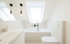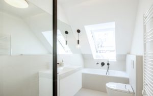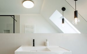 Anthrazitfarbene Elemente wie Griffe, Lampen und Armaturen setzen gezielte Akzente, die sich konsequent auch im Bad wiederfinden, das in klarem Weiß gehalten ist.